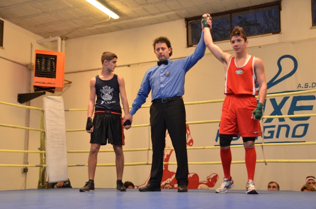 FOLIGNO, 23-12-2011 di Vezio Romano- E' stata di buon livello, sia tecnico che agonistico, la tradizionale riunione di fine anno della Boxe Foligno, nel corso della quale sono stati premiati per il loro costante impegno gli arbitri Ciccotti, Giacomelli, Montagnini e Renzini. Negli junior 56 kg ottima prova di Pozzi difronte a Colapinto. Nonostante lo svantaggio in altezza Pozzi ha preso subito il sopravvento ed ha piazzato un pregevole gancio sinistro, costringendo l'avversario al conteggio.Ha poi continuato con azioni a due mani con le quali ha chiuso il combattimento. ![]() Pozzi batte Colapinto, arbitro Giacomelli Negli Youth 56 kg , dopo due equilibrate riprese Guarnieri ha prevalso su Sensini, fermato per una ferita all'arcata spraccigliare sinistra. Nei 64 kg ha ben figurato Rota che ha superato nettamente Migni, imponendogli un conteggio nel secondo round. Negli elite 64 kg Chiovetta ha costantemente anticipato De Laurentis, conquistando una larga vittoria. Nei 69 kg bello scontro fra Francesconi e Hoxha che ha ottenuto al termine il verdetto di stretta misura. Nella stessa categoria Zenzero si è imposto nettamente su Minciotti, mostrando un buon repertorio di colpi.