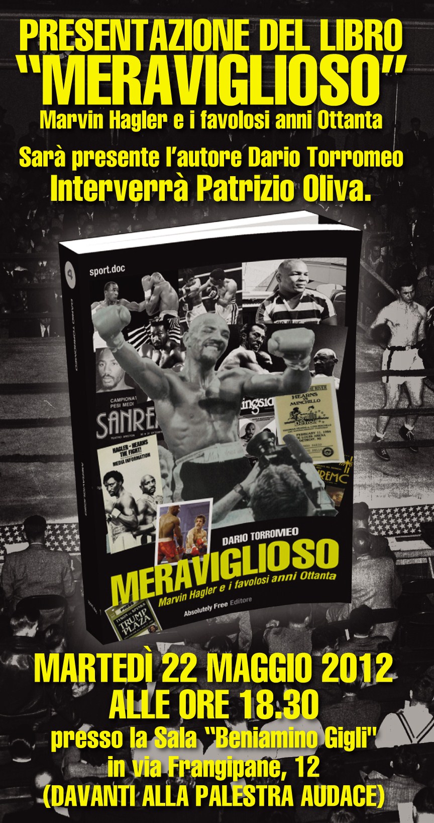 Il giornalista Dario Torromeo parlerà del suo ultimo lavoro sul mondo della boxe datato anni '80Martedì 22 maggio, alle ore 18.30, presso la Sala “Beniamino Gigli" a Roma (in via Frangipane 12, davanti alla Palestra Audace, il cui presidente Cesare Venturini ha contribuito alla realizzazione dell'evento), Dario Torromeo presenterà il suo libro “Meraviglioso - Marvin Hagler e i favolosi anni Ottanta". Interverrà Patrizio Oliva assieme a importanti personaggi del mondo della boxe. Fonte: Alfredo Bruno