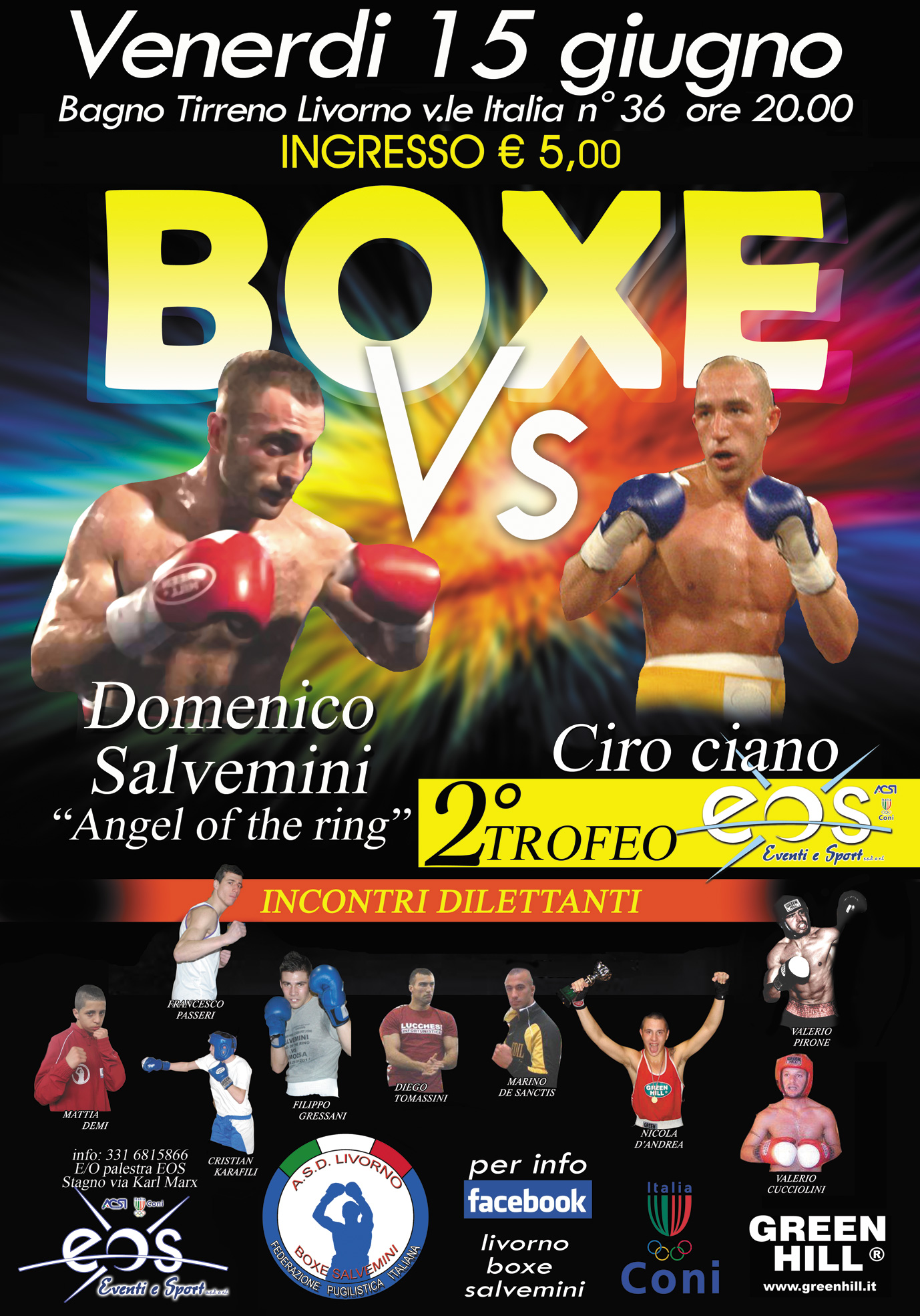 Domenico Salvemini al terzo impegno della stagioneVenerdi 15 giugno, presso lo stabilimento Bagno Tirreno di Viale Italia l’ASD Livorno Boxe Salvemini condotta dal M.o Donato Salvemini, in collaborazione con il M.o sergio Pulimeno, organizza il secondo trofeo EOS, dove ci saranno 11 incontri tra dilettanti ed un incontro professionistico tra Domenico Salvemini e Ciro Ciano che si misureranno al limite dei pesi superwelter. L’incontro a torso nudo non tradirà gli spettatori in quanto Ciano è un pugile giovane, molto bravo ed esperto, con 19 incontri alle spalle. Per Salvemini, amministrato dal manager De Clemente, sarà il terzo match dell'anno. Domenico ha detto di aver fatto grandi passi in avanti dopo il confronto con Nicchi per il titolo italiano dei medi jr. Ha aggiunto di sentirsi molto migliorato, sia sotto l’aspetto tecnico che nella gestione delle riprese da disputare. Il lavoro in palestra lo gratifica molto anche durante i test match. Domenico ha fatto una grande preparazione per le otto riprese che dovrà disputare il 15 giugno. Per questo scopo si è allenato più volte con Francesco Di Fiore da Prato, che venerdì prossimo si confronterà con Adriano Nicchi per il titolo italiano, e con Lenny Bottai di Livorno, ai quali va un ringraziamento particolare. Salvemini si sente pronto per una seconda chance al titolo italiano. In alternativa vorrebbe misurarsi per un campionato internazionale. Sarà importante vedere cosa potrà prospettare il suo mentore De Clemente, il quale punta molto su questo ragazzo. Domenico, uno stakanovista del ring, proprio non vuole fermarsi. Ha chiesto di poter combattere ancora a metà ottobre e vedremo di accontentarlo. Fin da ora ci stiamo dando da fare per il prossimo evento, ma rimaniamo con la testa sulle spalle e pensiamo di fare un passo alla volta. Giovedi 14 giugno, presso il bar Feeling gestito da Domenico, situato al numero civico 45 di Viale Italia in Livorno, si terrà la conferenza stampa ufficiale dell’evento che avrà inizio alle ore 17,00. Negli stessi locali, dove viene gestita la prevendita dei biglietti, si svolgeranno le operazioni di pesatura e visita medica dei professionisti. Il costo del biglietto è di € 5,00 ed ha un valore simbolico rispetto alla programmazione della serata pugilistica. Può essere inteso come un semplice contributo. In questo momento di grave congiuntura economica l’organizzazione ha inteso concedere gratuitamente l’accesso ai minori di 13 anni, con l’auspicio che i giovanissimi possano avere il giusto approccio con il pugilato. Domenico Salvemini ringrazia pubblicamente il suo sponsor ufficiale Infortunistca Lucchesi per il costante sostegno che gli riserva, riconoscendogli la fiducia ed il credito fin dal suo debutto. Comunicato Stampa Donato Salvemini ![]()