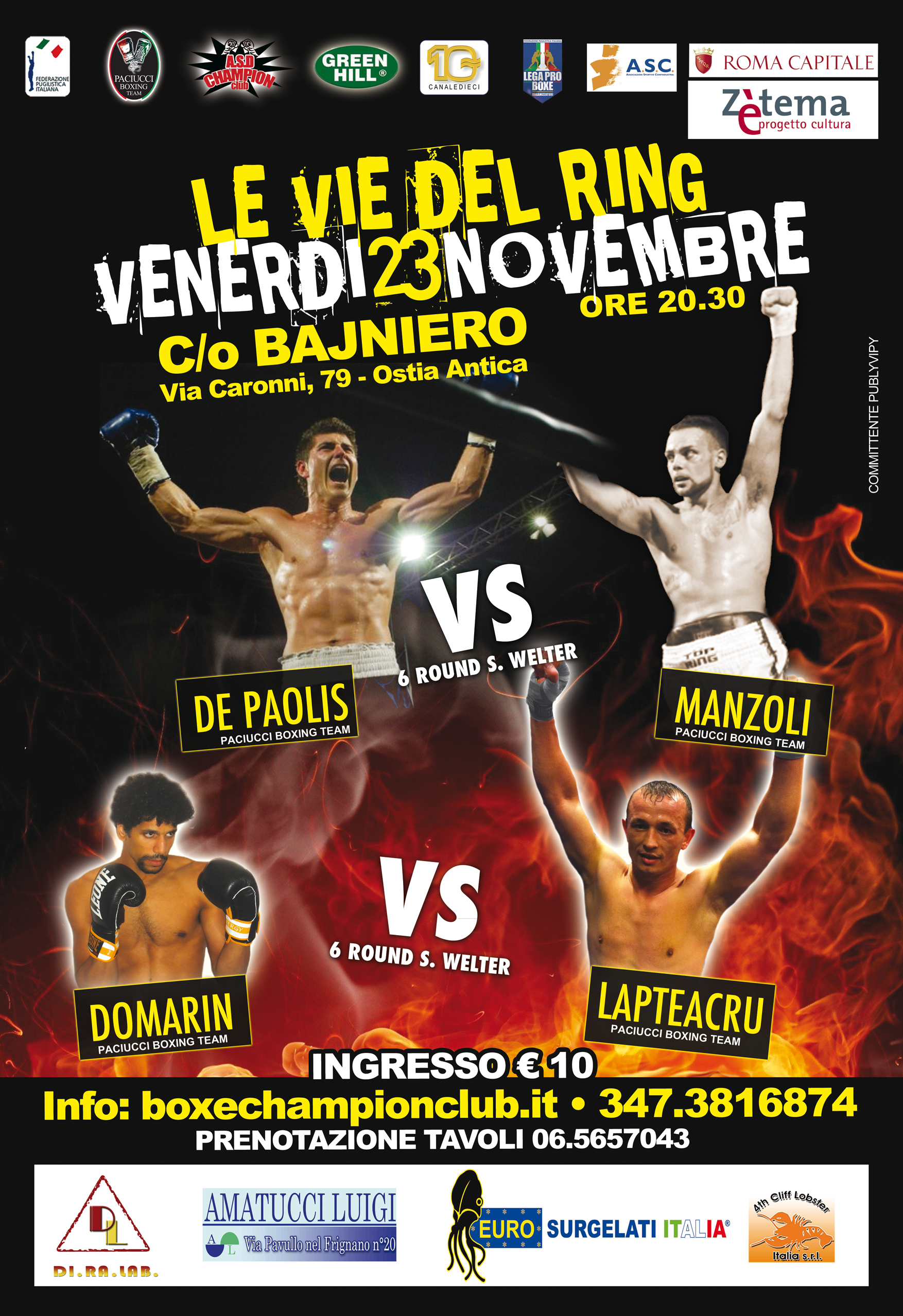 TORNEO PESI SUPERWELTER “LE VIE DEL RING”ORG. A.S.D CHAMPION CLUB & PACIUCCI BOXING TEAMVenerdì 23 novembre 2012Ostia Antica: Ristorante Bajniero in Via Caronni 78Inizio alle ore 20,30PROGRAMMA Dilettanti Youth – Kg. 54: Giovanni Tagliola (Champion Club) c. Carlos Fernandez (Agoghe B. Il Mescolo) Schoolboys – Kg. 43: Daniele Di Benedetto (Champion Club) c. Daniel Spada (Roma Tricolore) Juniores – Kg. 60: Simone Carotenuto (Champion Club) c. Marco Castellucci (Oi Team Boxing Pomezia) Youth – Kg. 64: Valerio Mazzulla (Roma Tricolore) c. Geraldo Brahuschi (Universo) Youth – Kg. 64: Fabio Moretti (Pro Fighting Roma) c. Jacopo Fazzino ( Boxing Functional Training) Elite - Kg. 64: Santo Arnone (Nettunese) c. Marco Arca (Oi Team Boxining Pomezia) Professionisti Superwelter 6: Patrizio Manzoli (Paciucci Boxing Team) c. Marco De Paolis ( Paciucci Boxing Team) Superwelter 6: Alessio Domarin (Paciucci Boxing Team) c. Ion Lapteacru ( Paciucci Boxing Team) Fonte: Alfredo Bruno