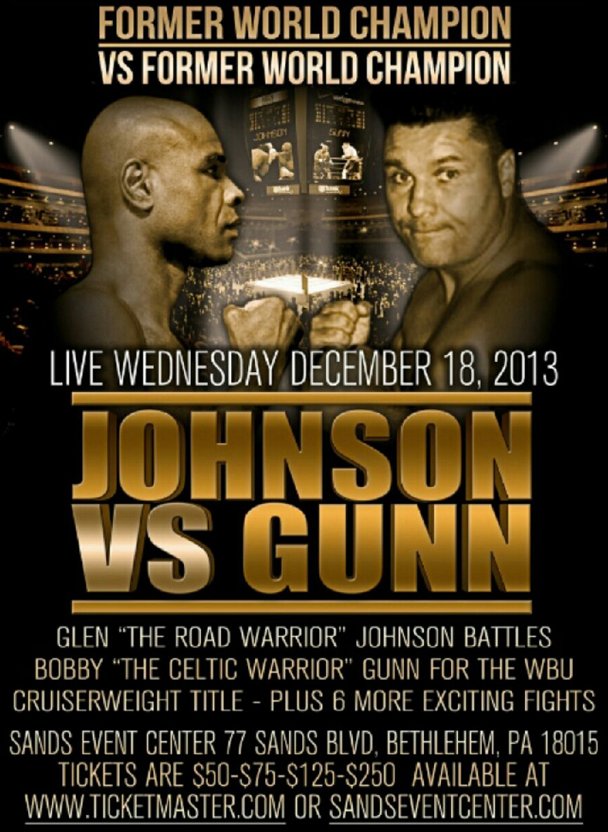 Bobby Gunn vs. Glen Johnson WBU World Title Clash"Celtic Warrior Vs. Road Warrior"By Gianluca (Rio) Di Caro Tonight at the Sands Casino in Bethlehem, PA. Bobby “The Celtic Warrior” Gunn and Glen “The Road Warrior” Johnson go head to head for the vacant World Boxing Union (WBU) Cruiserweight World Championship. Whilst Johnson has stepped in at the last minute, following Roy Jones Jr. pulling out just a couple of weeks ago, in order to compete in Russia for the lesser WBUv title, as well as that this being Johnson’s first fight in the Cruiserweight division, you can be sure that the ‘Road Warrior’ will be more than ready for the challenge ahead, as becomes very, very clear when you look at his Championship record. Originally hailing from Jamaica but now residing in Miami, Florida, Johnson is a seven time Champion, WBC Continental Americas Super Middleweight, IBF Inter-Continental Super Middleweight, WBO Inter-Continental Light Heavyweight, USBA Light Heavyweight, IBF World Light Heavyweight, IBO World Light Heavyweight and IBA World Light Heavyweight champion. In July 1997 and with an exemplary 32 (22KO) unbeaten record, Johnson’s first championship bout was when he challenged current Light Heavyweight King Bernard Hopkins for his IBF Middleweight crown, unfortunately for Johnson his precious ‘0’ went via an eleventh round stoppage. It would be nearly two years later before the ‘Road Warrior’ was back in Championship action, this time successfully defeating Troy Watson, on points, to secure the WBC Continental Americas Super Middleweight title. Six months later Johnson successfully defended the WBC title, with a first round stoppage victory over Marcello Zimmerman. The following month Johnson was back in Championship action, this time travelling to Dusseldorf in Germany to challenge Sven Ottke for the IBF Super Middleweight crown, it was a close fight but Johnson once again failed to capture the IBF crown – Judges Luca Montella and Arno Pokrandt both scored the bout 113-115 whilst judge Harry Davis scored it 112-116, all in favour of Ottke. In April 2000 Johnson once again crossed the Atlantic, this time to face Silvio Branco in Padua, Veneto, Italy for the vacant World Boxing Union World Super Middleweight title, once again it was down to the judges to decide the outcome and once again Johnson was to lose out - the scores were: judge Francesco Rega 226-236, judge Dave Stone 221-238 and judge Des Boyd 222-237 Five months later the ‘Road Warrior’ once again booked a transatlantic flight, this time in order to face Toks Owoh at the famous York Hall in London, for the vacant IBF Inter-Continental Super Middleweight title, finally Johnson secured an IBF title, by way of a sixth round stoppage of the London based Owoh. In July 2001 Johnson found himself back in Germany, this time at the Estrel Convention Center in Berlin to challenge Thomas Ulrich for the WBO Inter-Continental Light Heavyweight title. This time Johnson made sure he returned from Germany with the belt, conclusively knocking out Ulrich in the sixth. A few non-championship bouts followed before, on 18th May 2003, Johnson was once again to be in Championship action, when he beat Eric Harding on points to lift the vacant USBA Light Heavyweight Championship belt. In November Johnson headed across the Atlantic to Great Britain, to face Clinton Woods for the vacant IBF Light Heavyweight title, at the Hillsborough Leisure Centre in Sheffield. After twelve sensational rounds of boxing the bout was declared a draw. So in February 2004 Johnson once again made the journey to Sheffield, this time the Ponds Forge Arena, to face Woods for the vacant IBF title, this time the judges did declare a winner – Johnson. Seven months later, in Memphis, Tennessee, Johnson defended his IBF Light Heavy crown, against no less than Roy Jones Jr. Whilst comfortably leading on all judges scorecards, Johnson ensured a successful defence by knocking out Jones Jr. in the ninth. Three months later Johnson went toe to toe with another legend, Antonio Tarver, for the IBO Light Heavyweight crown. After twelve close rounds it was once again down to the judges to call the result, Judge Marty Denkin scored the bout 112-116 in favour of Tarver, judges Chuck Giampa and Melvina Lathan both scored it 115-113 for Johnson. In the rematch, which took place exactly six months later, on the 18th June 2005, at the FedEx Forum in Memphis, Tennessee, Tarver regained his crown – judges Bill Clancy and John Rupert scoring the bout 112-116 and judge Rocky Young scoring it 113-115, all in favour of Tarver Three months later Johnson stopped George Khalid Jones in the tenth round of their IBF title eliminator, however before facing Clinton Woods again for the World crown, Johnson was to beat Richard Hall on points, to win the vacant IBA Light Heavyweight title. In September 2006 Johnson made his third trip to the UK to face Clinton Woods for the IBF crown, this time at the Bolton Arena in Bolton, with a win for Johnson and a draw, the pressure was all on Woods to bring them on level pegging, which he did, albeit by split decision, judges Roberto Ramirez Snr. and Rick bays scoring in favour of Woods, whilst Mickey Vann scored it in favour of Johnson. Johnson’s next Championship fight, in May 2007, was once again an IBF eliminator, this time against Montel Griffin, Johnson won it by an eleventh round stoppage. However it wasn’t the IBF title that Johnson fought Chad Dawson for in May 2008, it was the WBC Light Heavyweight World title, again Johnson was to lose on points, all three judges scoring the bout 112-116 for Dawson. Johnson’s next Championship outing, for the interim WBC and the IBO Light Heavyweight World title in November 2009, was also against Dawson and once again Dawson came away the winner on points. In February 2010, Johnson was on the IBF Championship trail, beating Yusaf Mack by sixth round TKO, in the final eliminator to face Champ