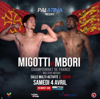 April 4, Lisieux, FRA: 10x3, w: Lucas Migotti, Fra W10-S Christophe Mbori Endanga, Fra Migotti won the vacant French welterweight title on a split decision: 97-93x2, 93-97. m: Louis Ameline, Fra W 6 (59-55) Damien Lacoudray, Fra 6x2, l-fly: Tania D'Almeida, Fra W6-U Dari Hernandez, Col 60-54x3. f: Marianne D'Antuono, Fra W4-U Pizagou Logerie, Fra 40-36x2, 39-37.